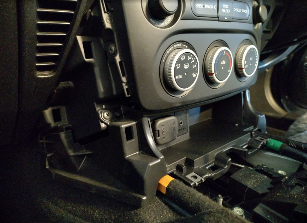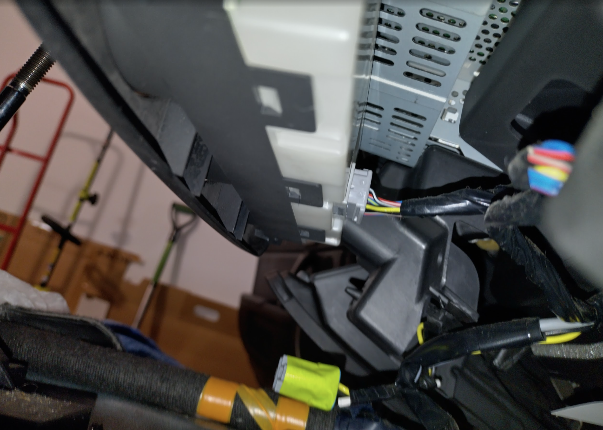 pull 3 plug(s) out of back of radio (reach in behind through the glovebox area if need be) – the big plugs both have tabs on them you have to press. There’s one on side which is the antenna, connected with just a small banana plug.