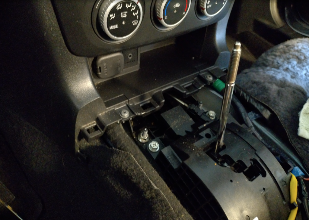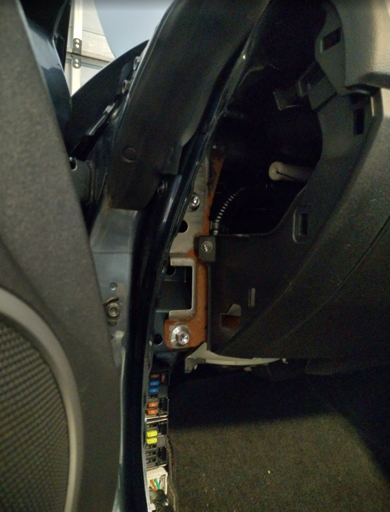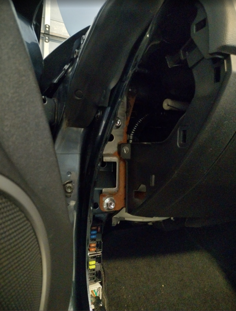 undo the bolt inside the dash (looking in from the steering well). If yours has had a radio replacement, this bolt may not be there anymore. I may not put it back as it’s a nightmare to get to. And to call it a nightmare after getting this far is saying something.