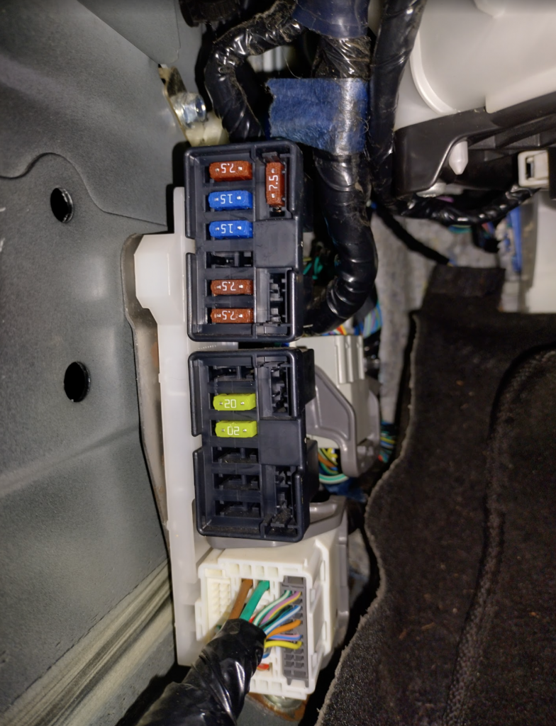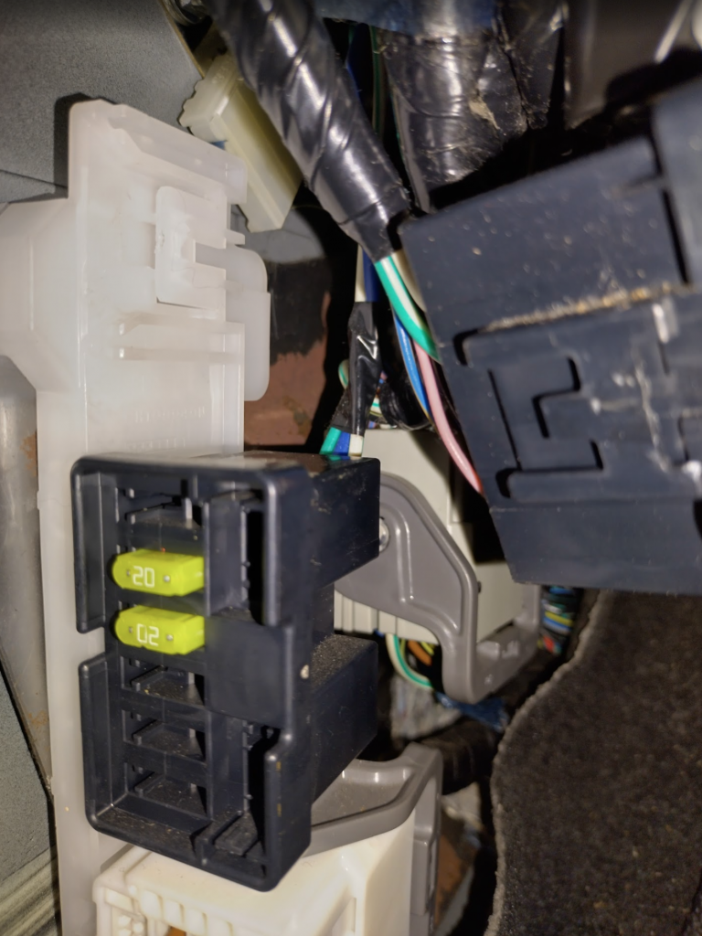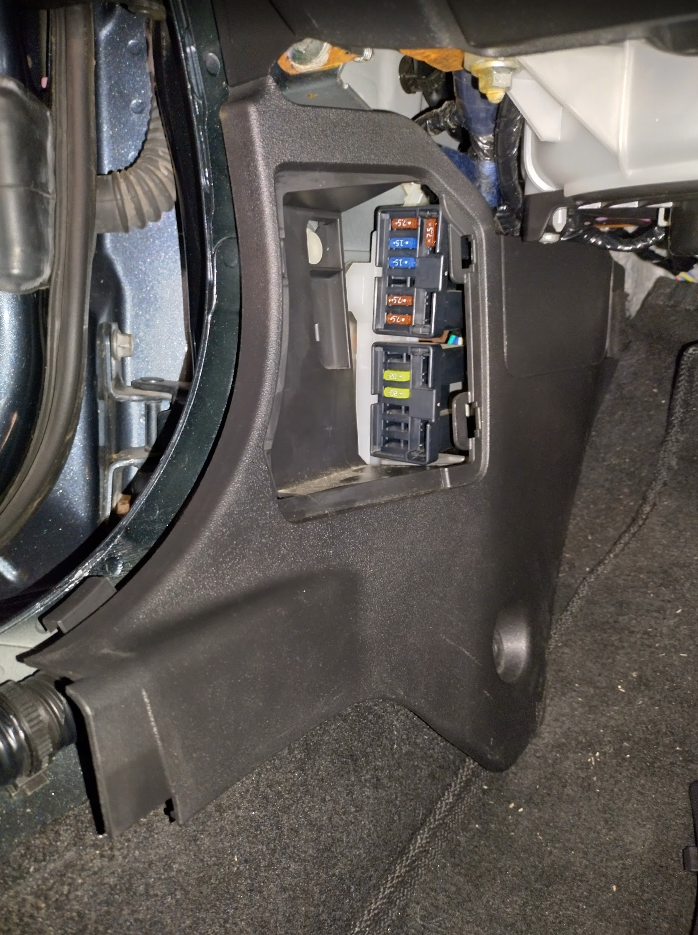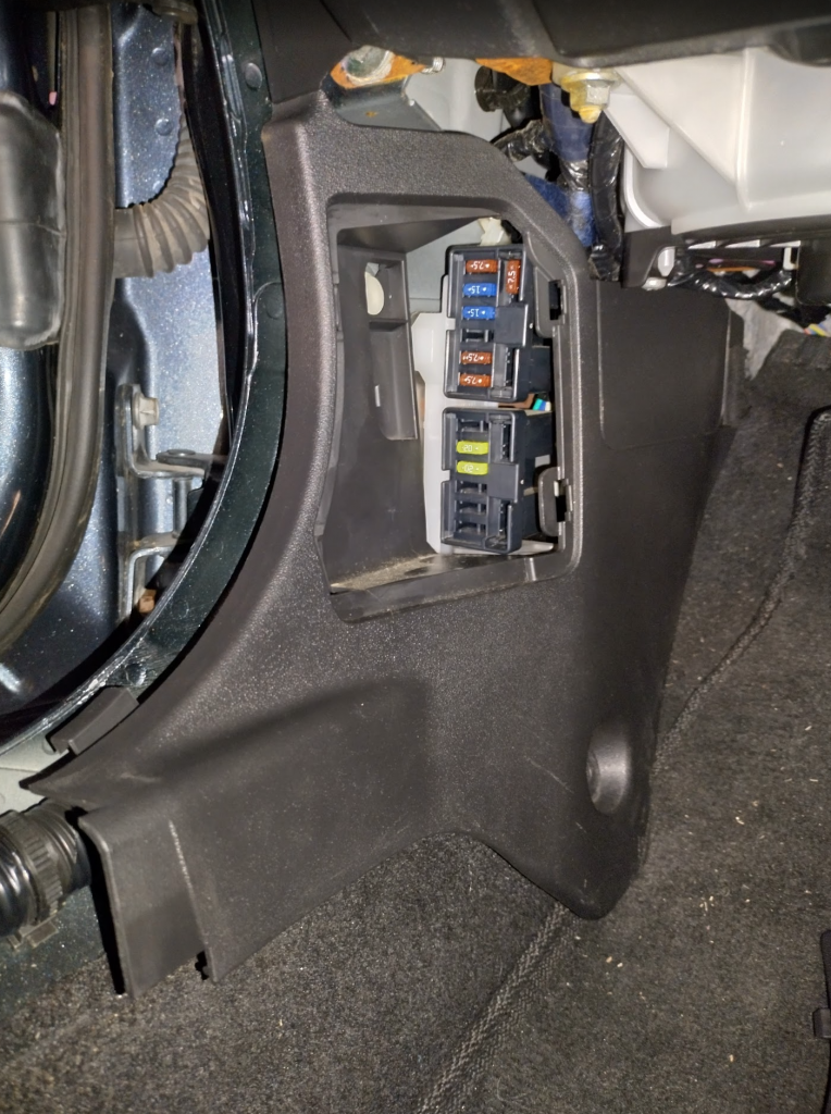 pop off entire fuse cover panel (there are two plastic plugs, one white hidden one which is meant to stay – so slide the panel down)