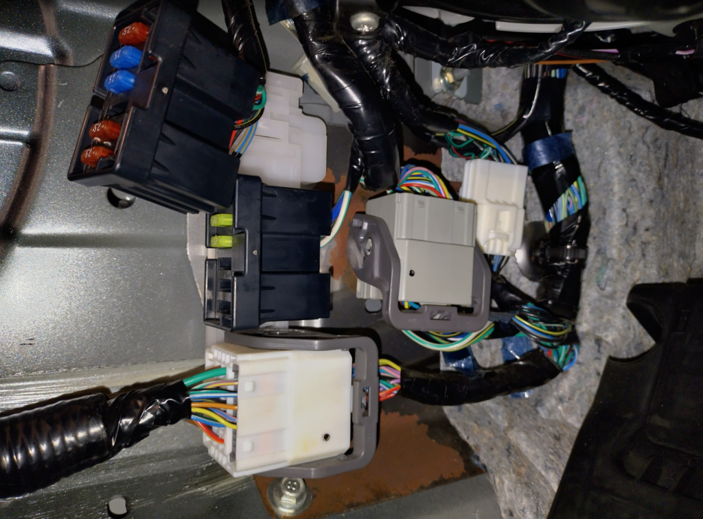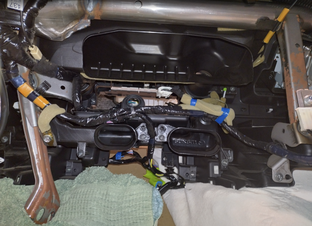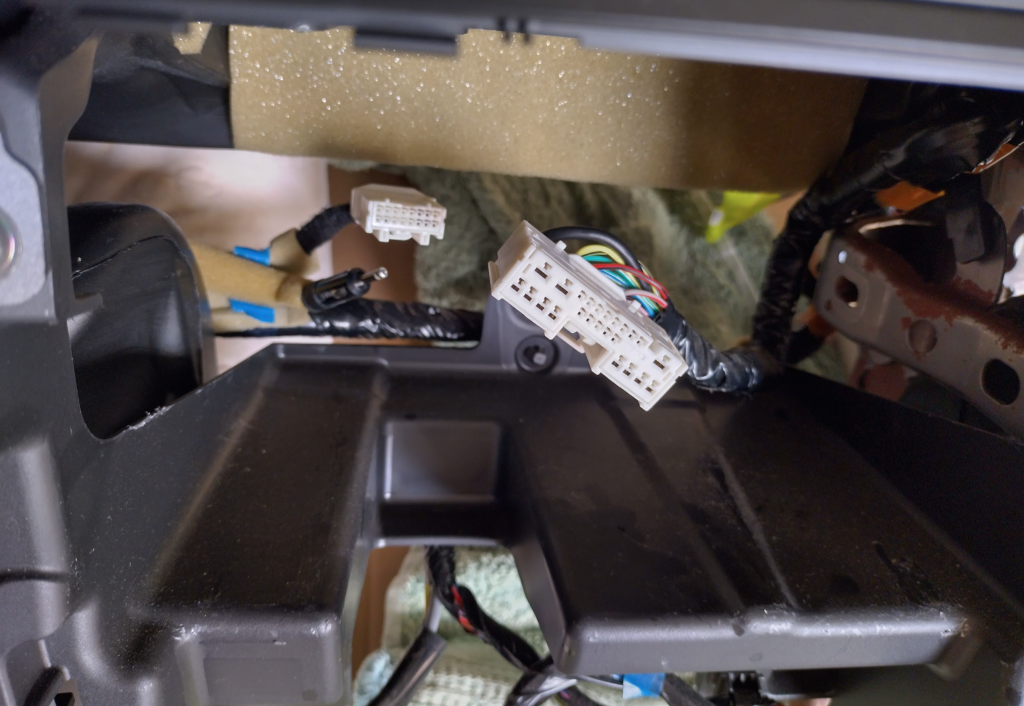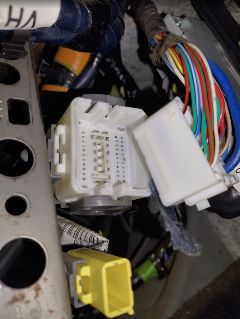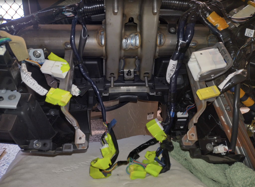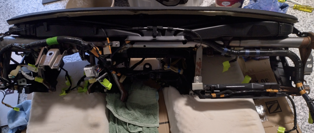 There are two wiring looms – one that stays connected to the firewall, the other is attached to the inner frame within the dashboard. The dashboard loom appears to be black, the firewall loom seems more like a dark blue?