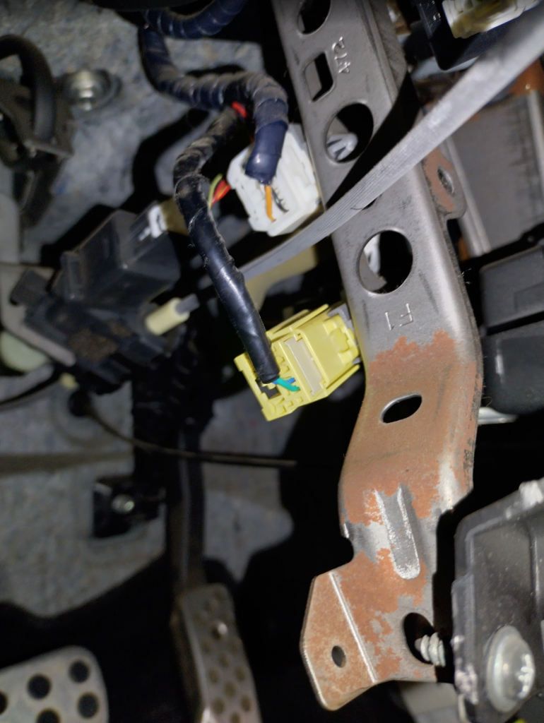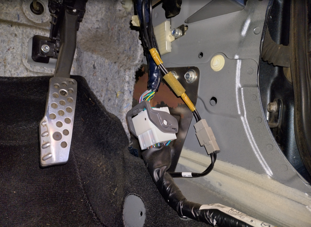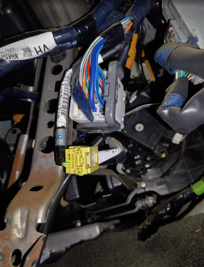 yellow plug (slide white bit to unclip) and big white plug on middle of the footwell