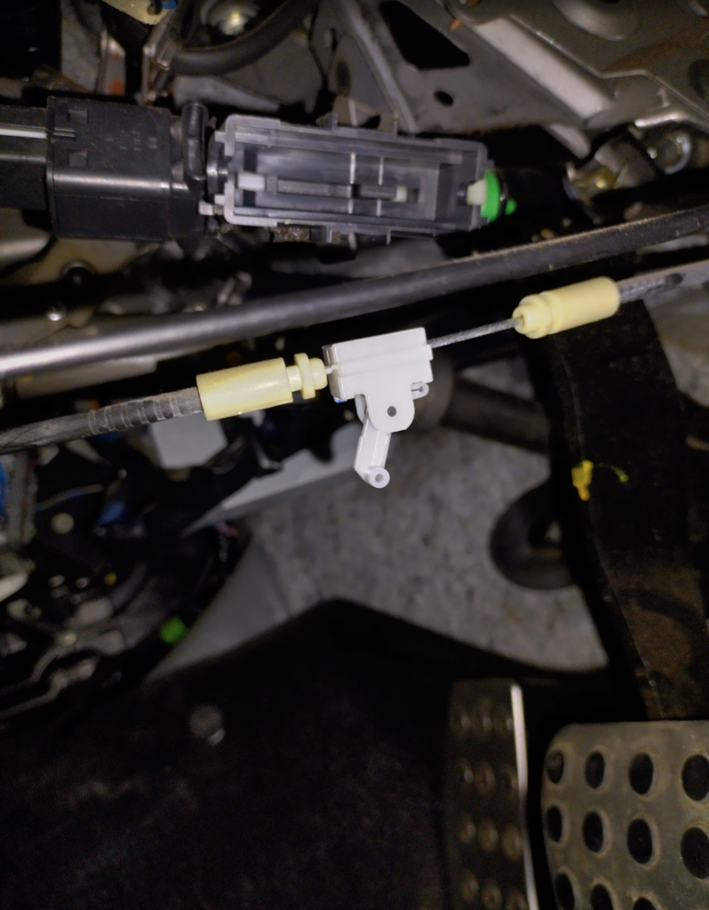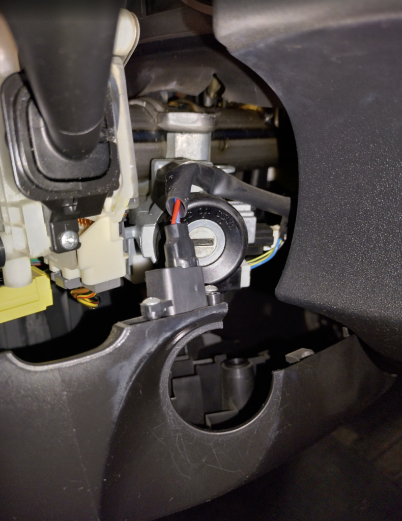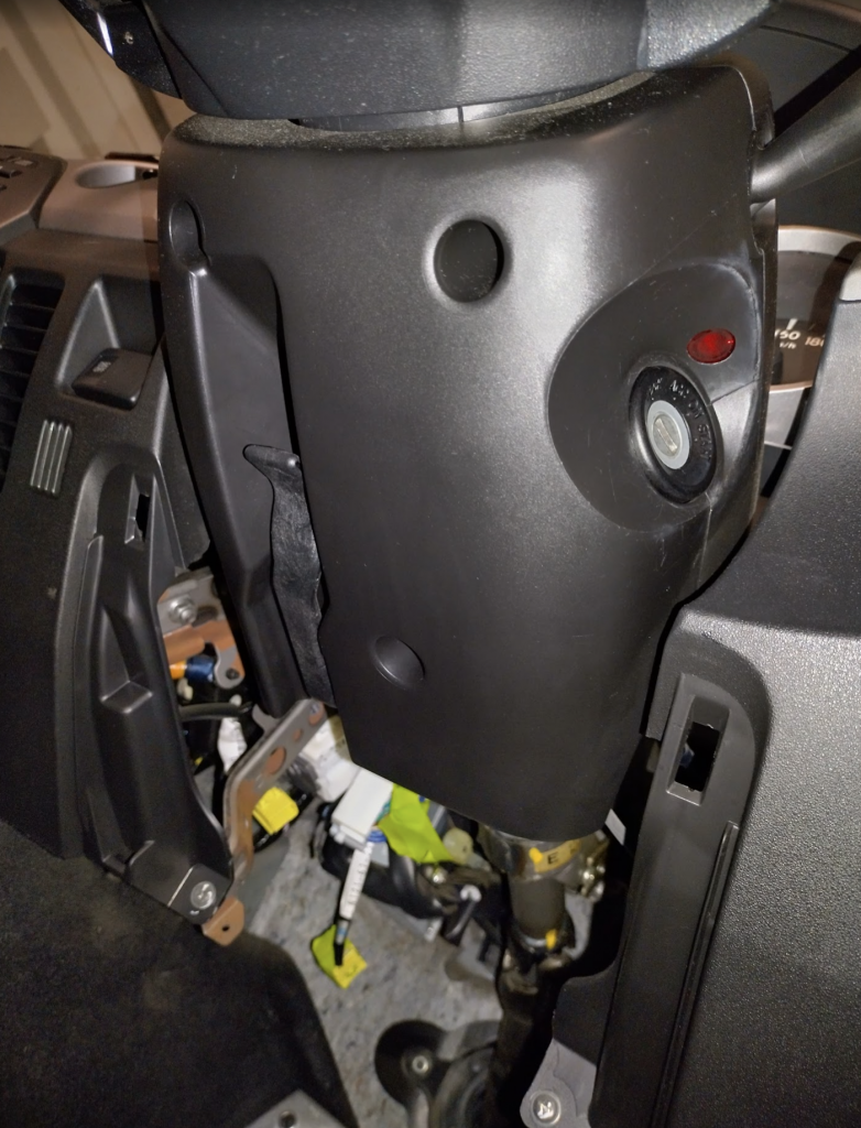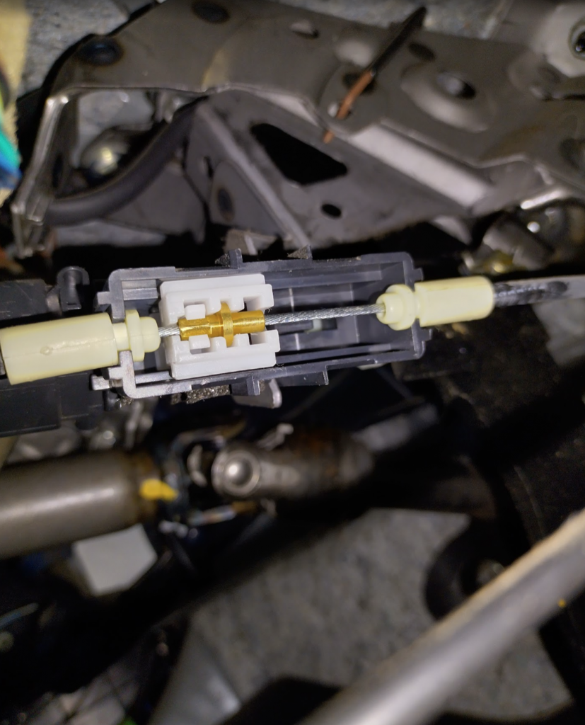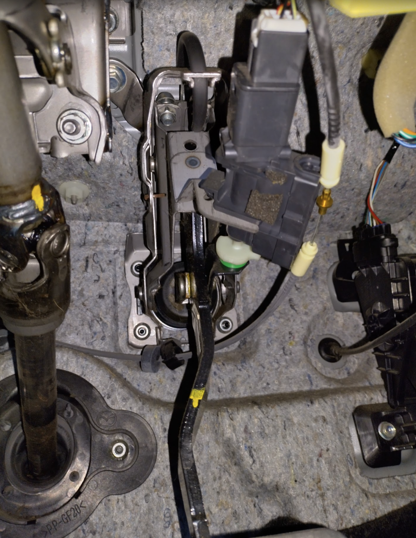 Also the firm cable directly from the ignition via the brake pedal and through to the centre console (The only name I have found might be ignition interlock cable? – prevents shifting gears or turning key if not in park) seems to be something that stops easy movement, I managed to get it caught on a bracket which caused the holder to split apart when trying to get the steering column back up. So if yours splits I have included photos here as I was unable to locate any on the entire internet of how it all goes back together.