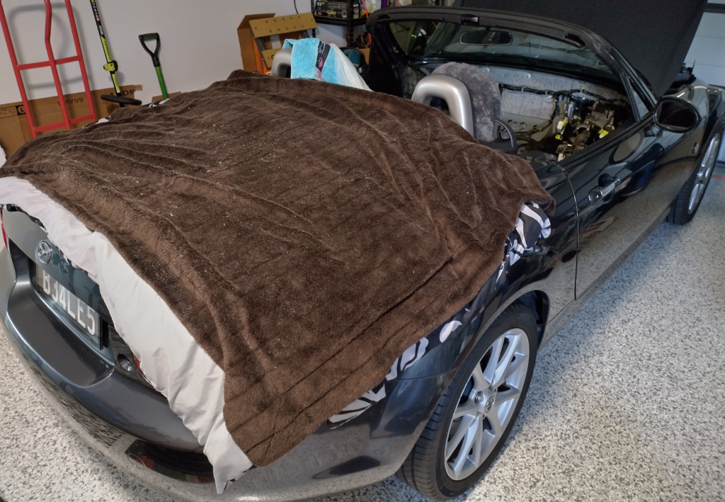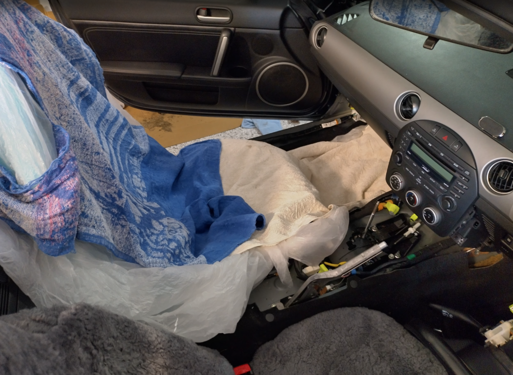 Cover the Passenger side seat and floor area with a drop sheet and towels.