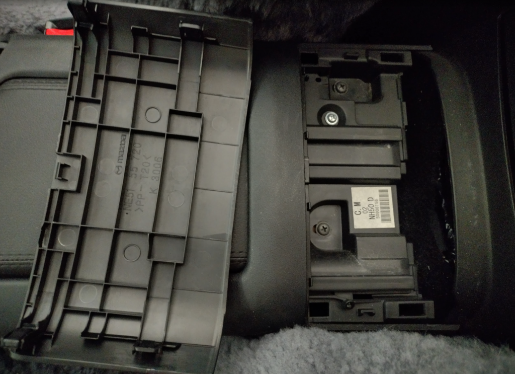 peel back carpet (a long way) & undo bolt at the far back (10mm) – leave carpet peeled back. Mine has a little velcro tap at the top corner which I think the sole purpose is so it can velcro to itself while peeled back to hold in position. If so, I hope the Mazda engineer got a bonus for this! Then fold back the black plastic door on the floor.