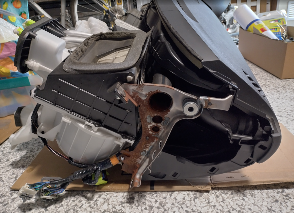 Here’s the dashboard & aircon assembly freshly removed from the car. The aircon comprises of both the right hand white section, and the attached smaller black section.