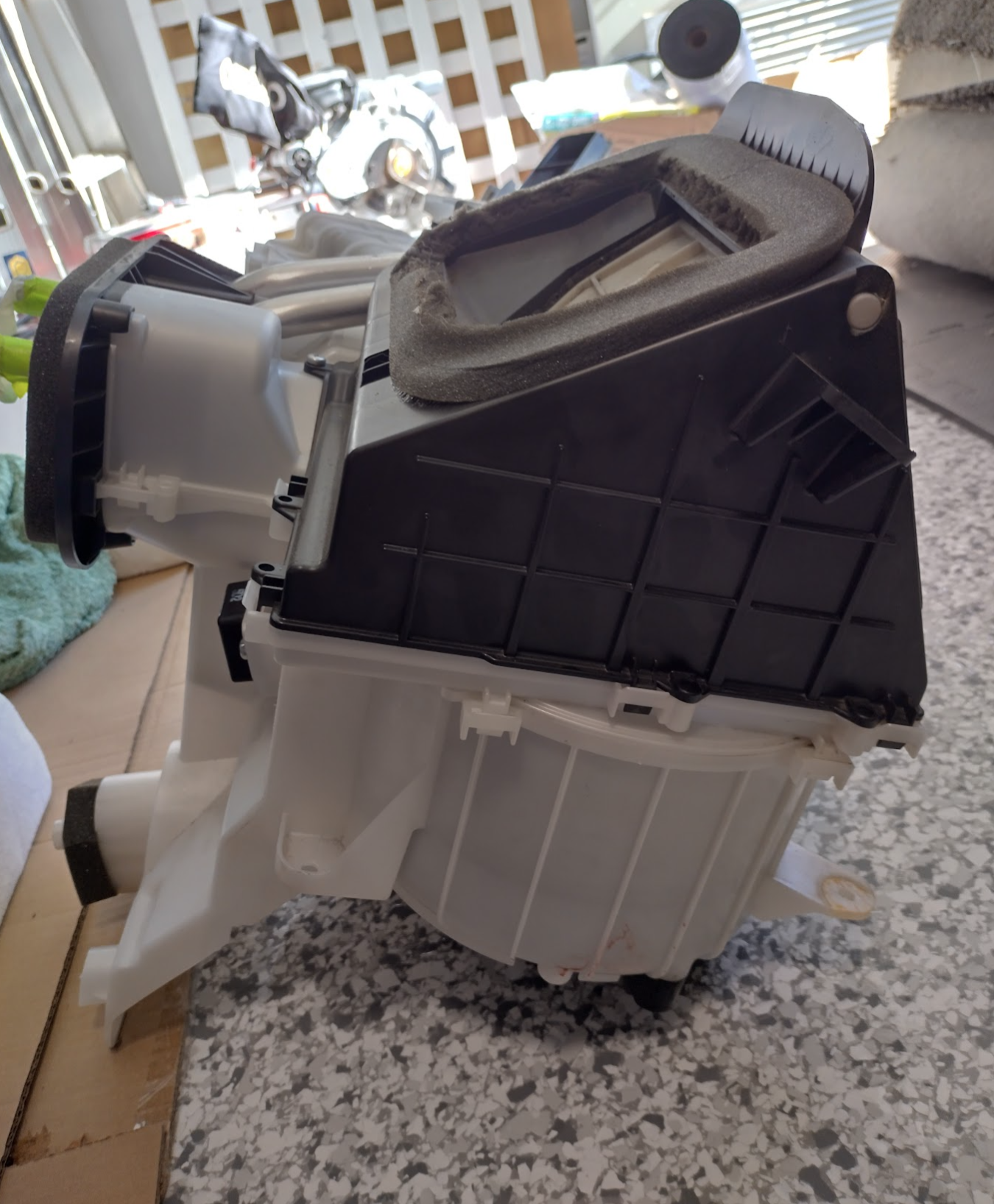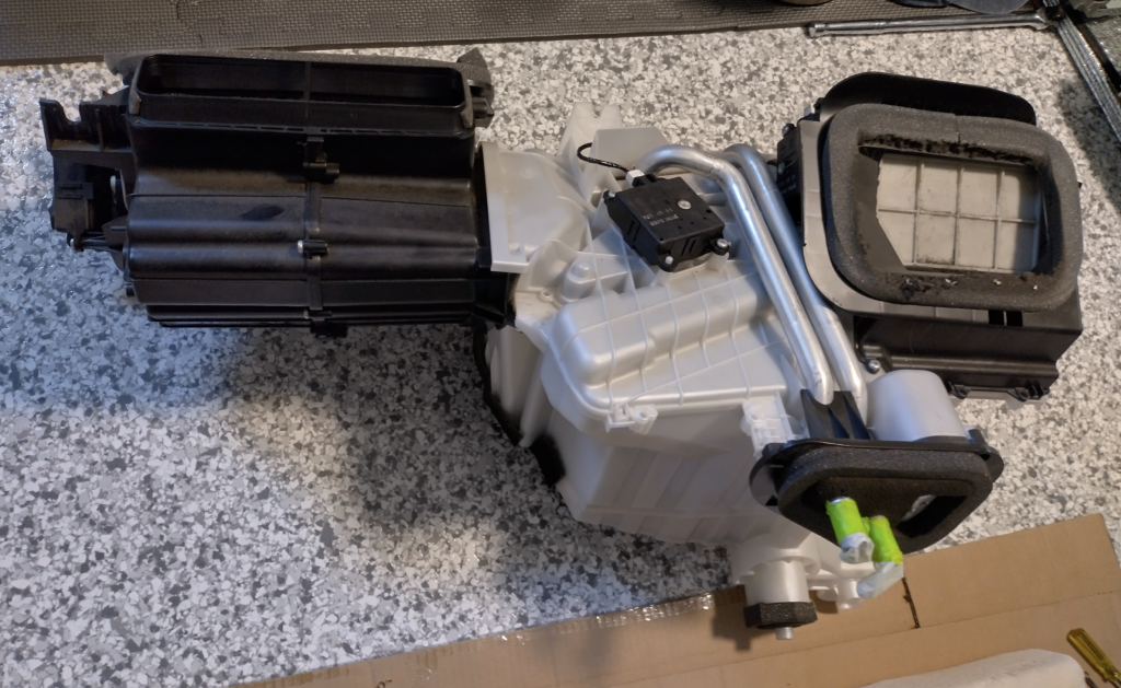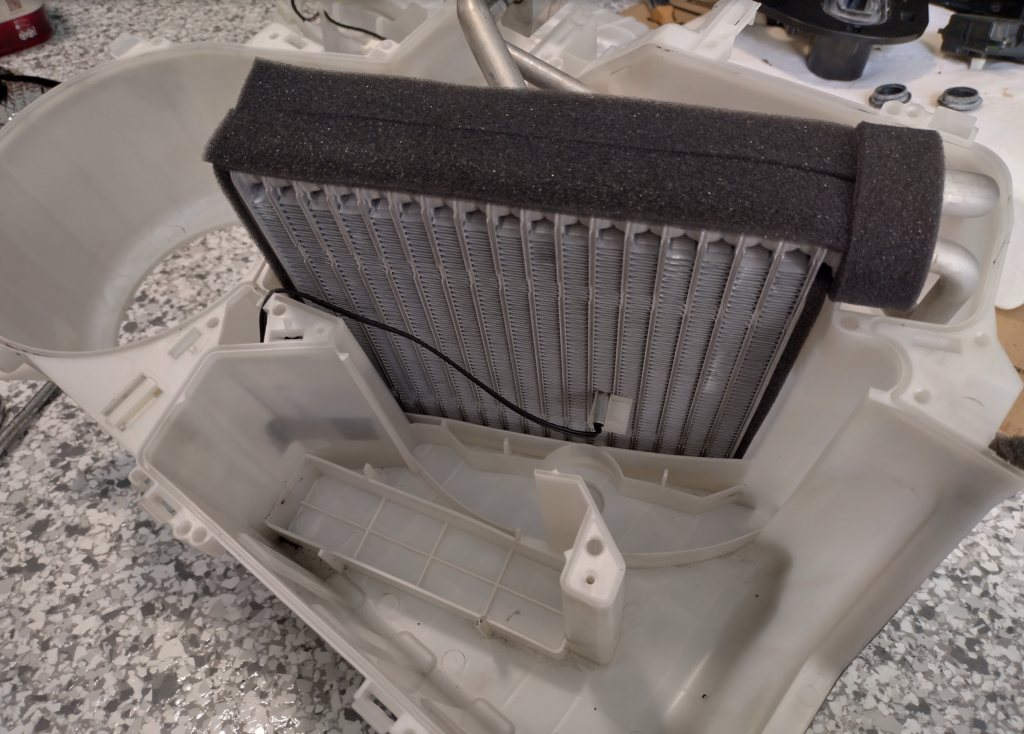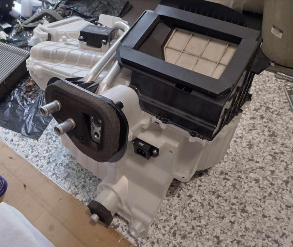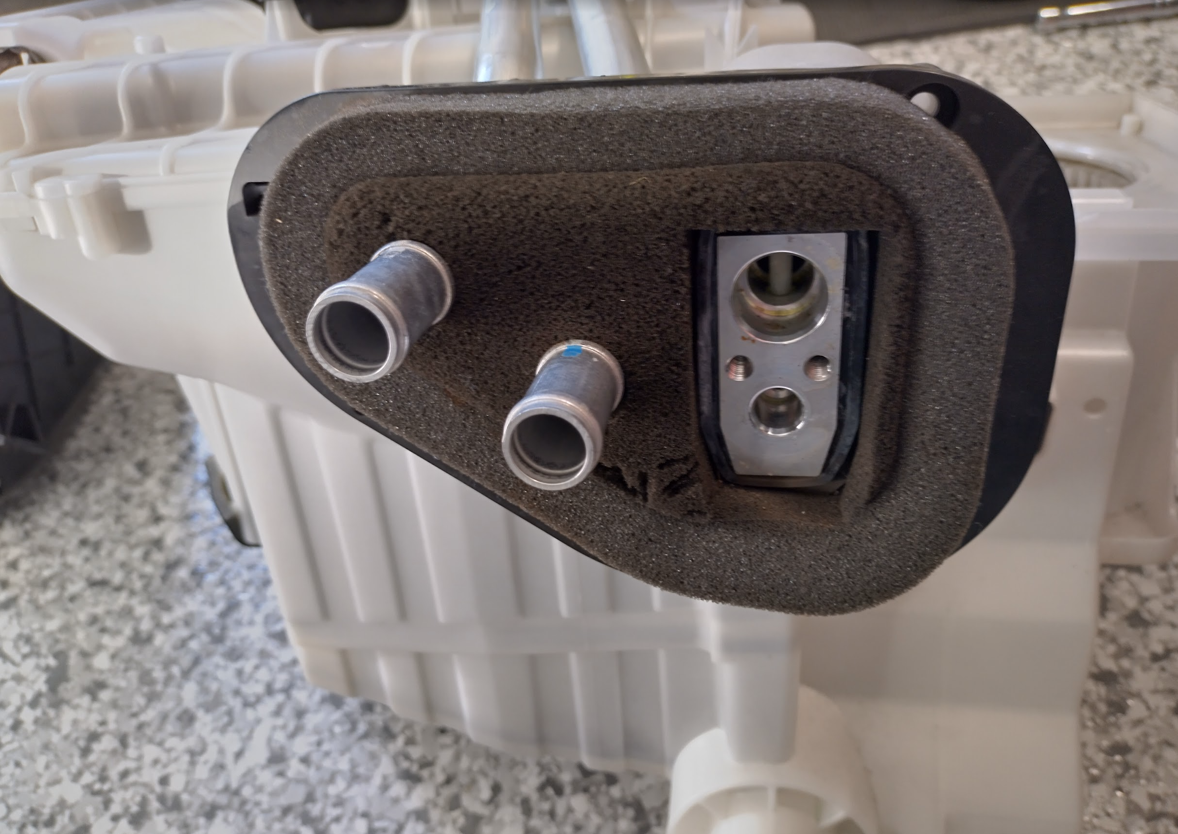 Then the rest of the parts have had a decent clean with all sorts of chemicals (the foam at the bottom of the evaporator area does actually come out), but while we wait for all of that to dry we can assemble the new evaporator with the old o-rings, pipes, new bolts, and stick foam all around it.