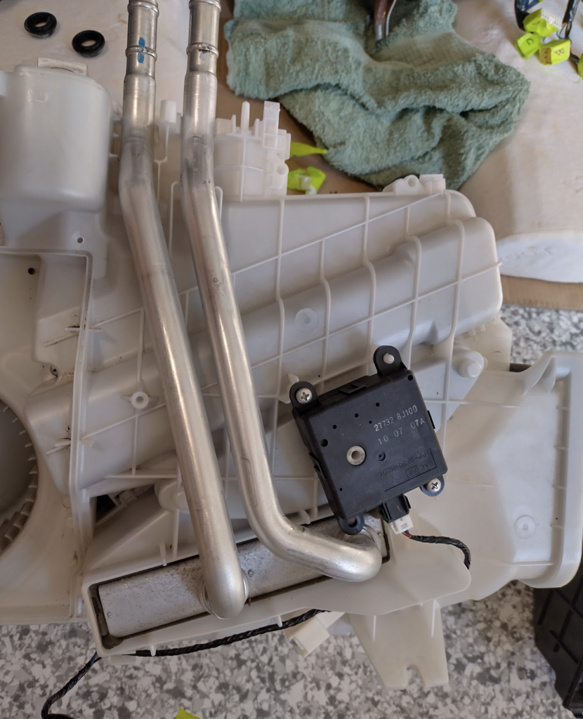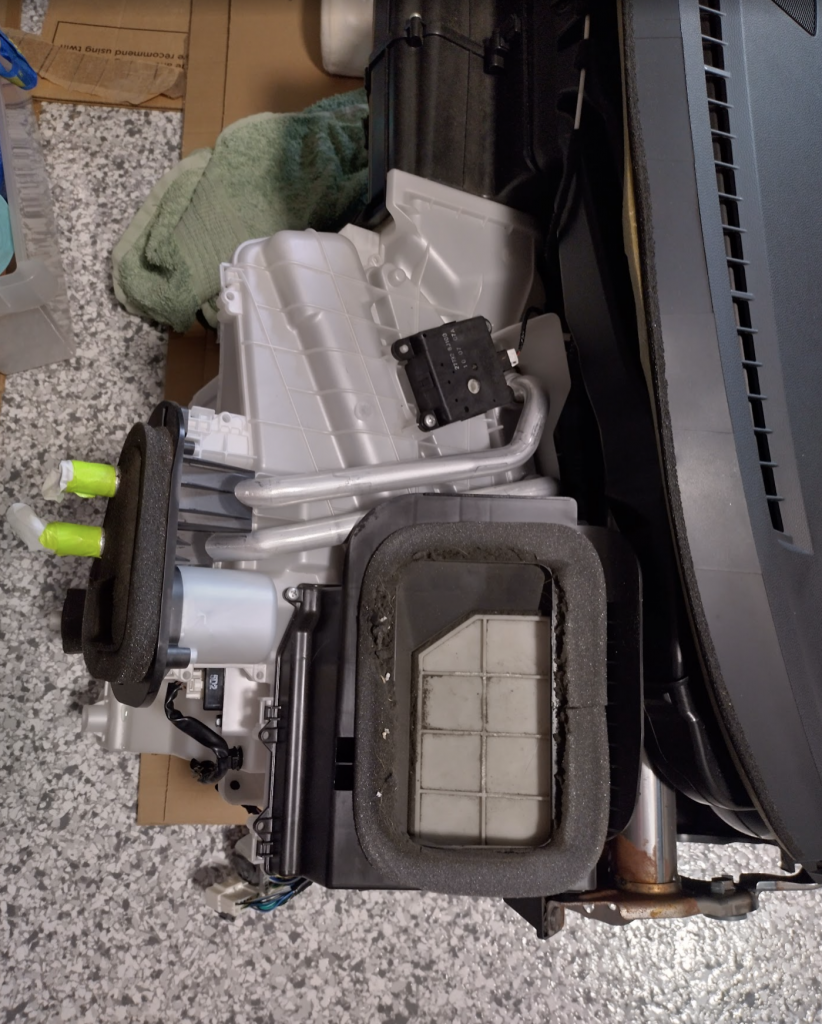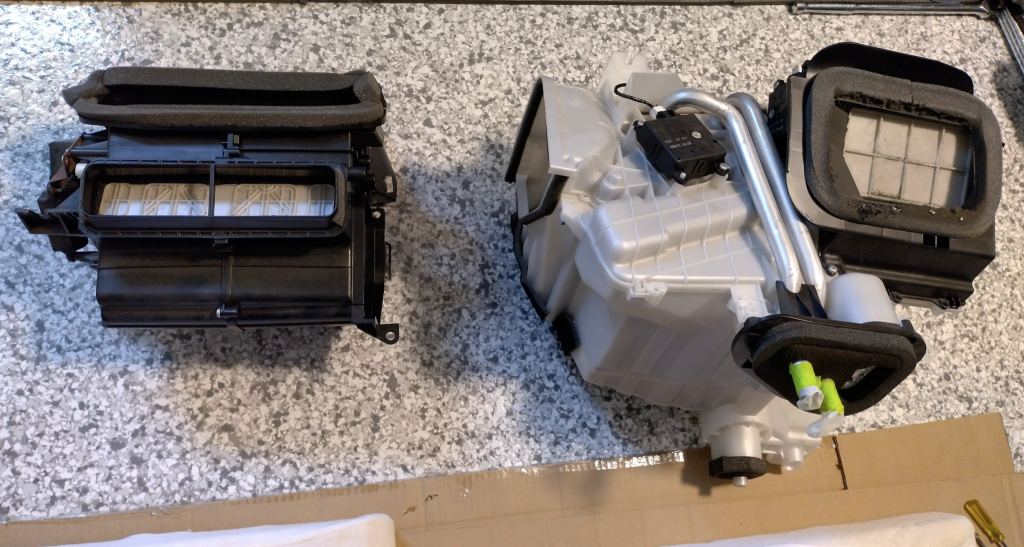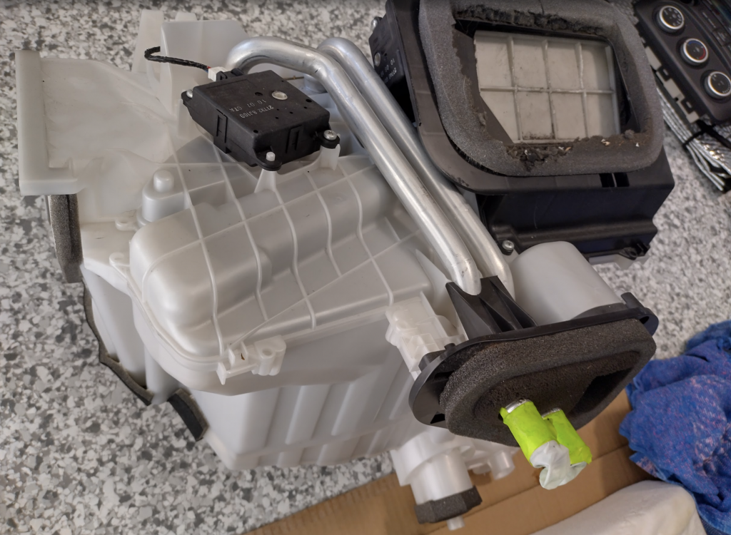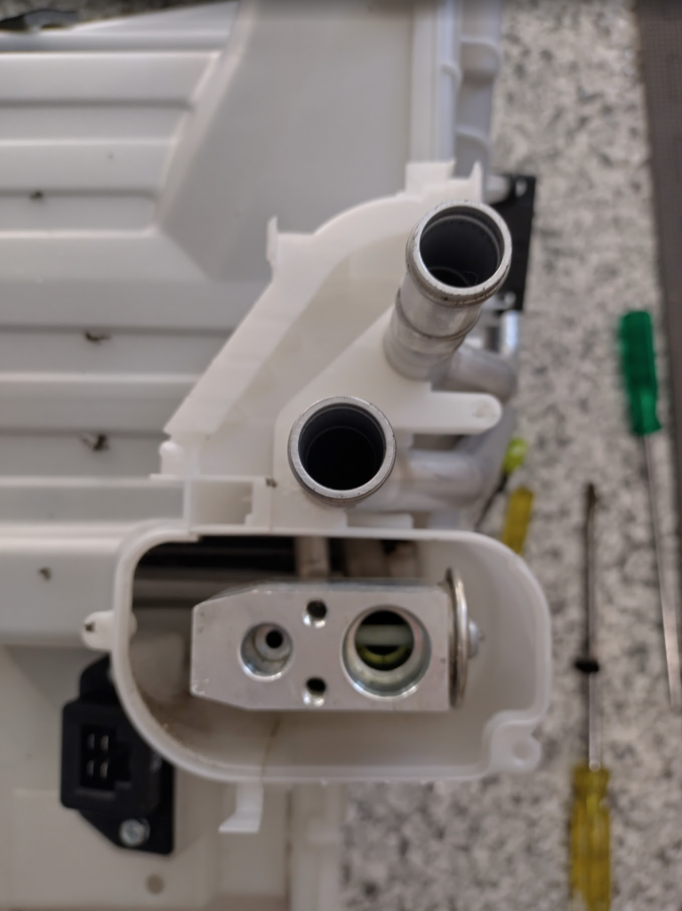 Then the rest of the parts have had a decent clean with all sorts of chemicals (the foam at the bottom of the evaporator area does actually come out), but while we wait for all of that to dry we can assemble the new evaporator with the old o-rings, pipes, new bolts, and stick foam all around it.