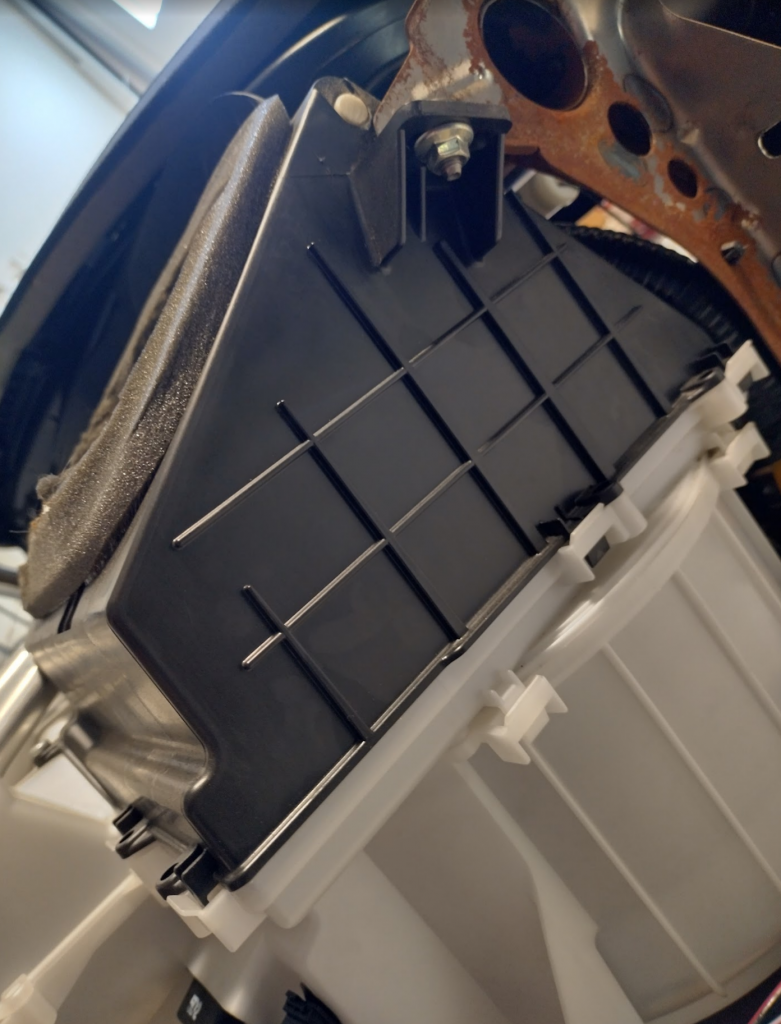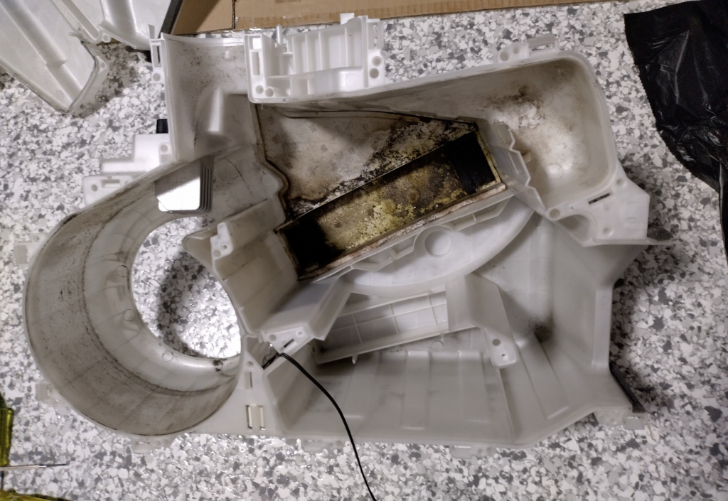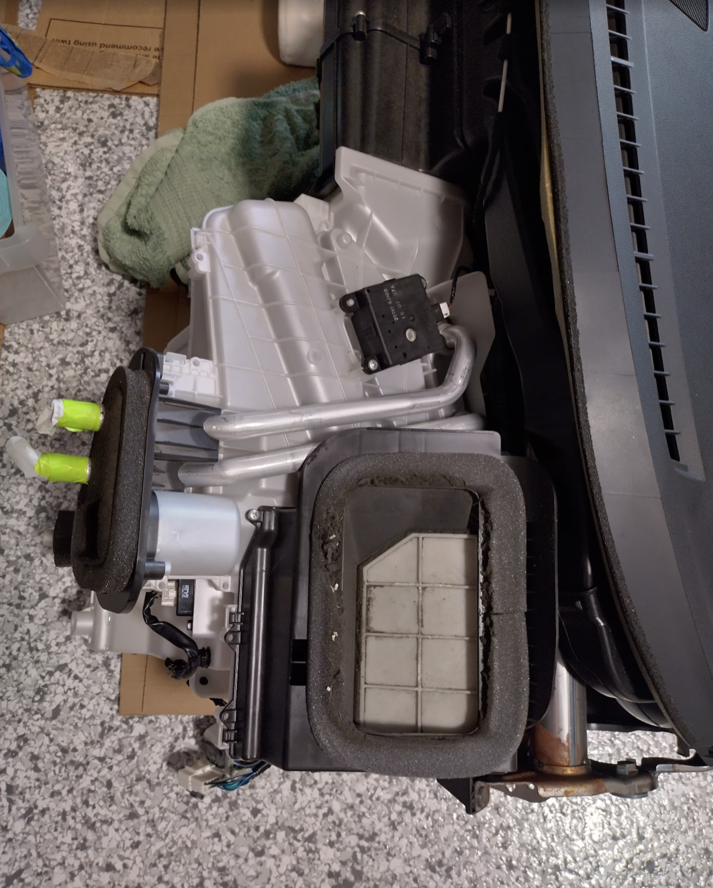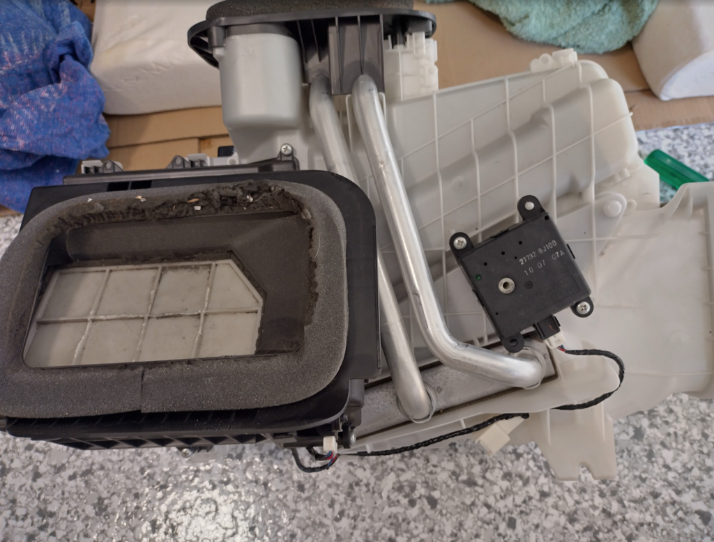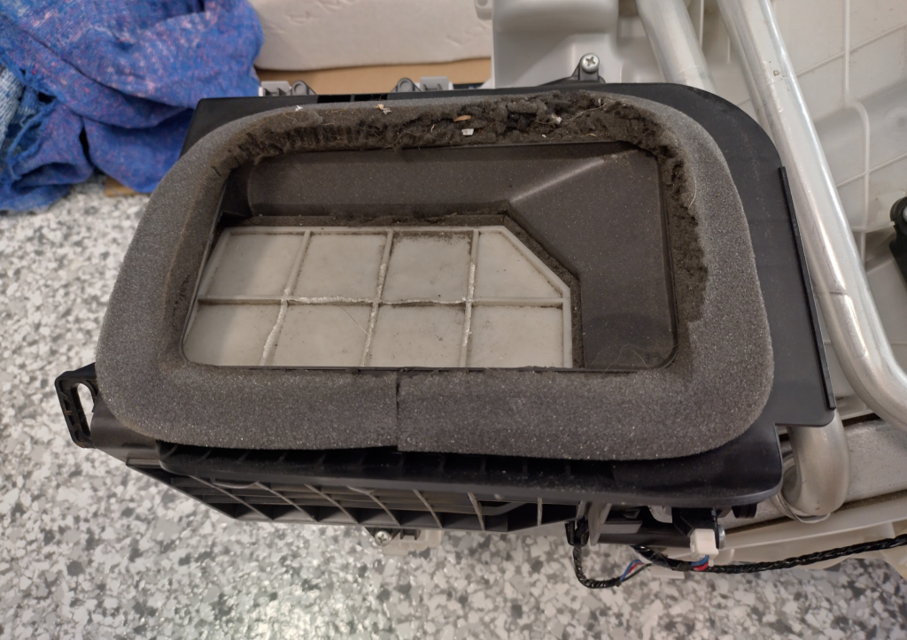 You can see the visible foam actually isn’t too bad for a 15 year old car that has lived outside for half of it’s life, however internally I think there’s an entire section missing & I’m unsure of the state of the internal foam-covered metal flaps and seals. I was shown a picture of the evaporator covered in debris from outside – it’s clear that mice have had a go at the foam and the flap seen on the right hand side so they must have wandered in at some stage, or maybe just made a nest on top of it that got sucked in.