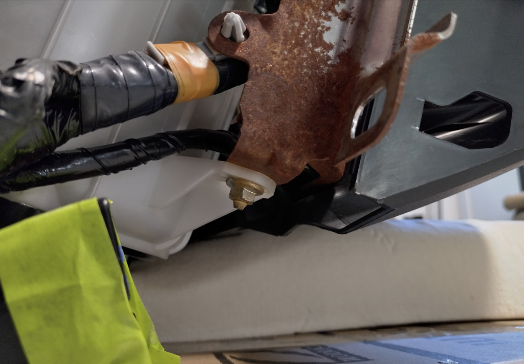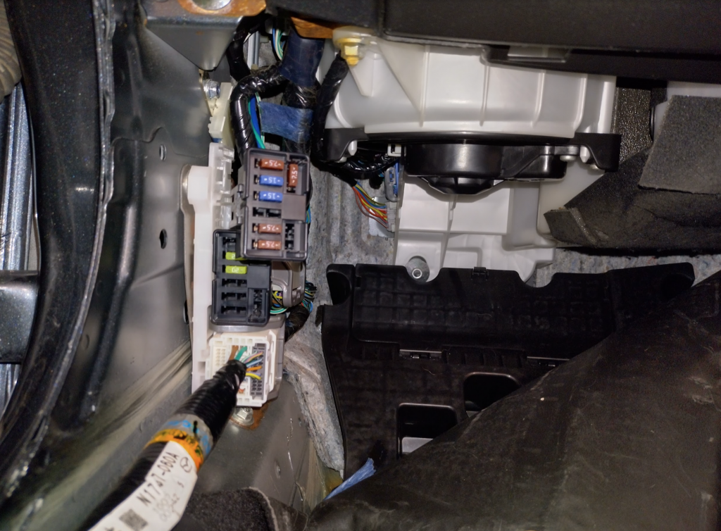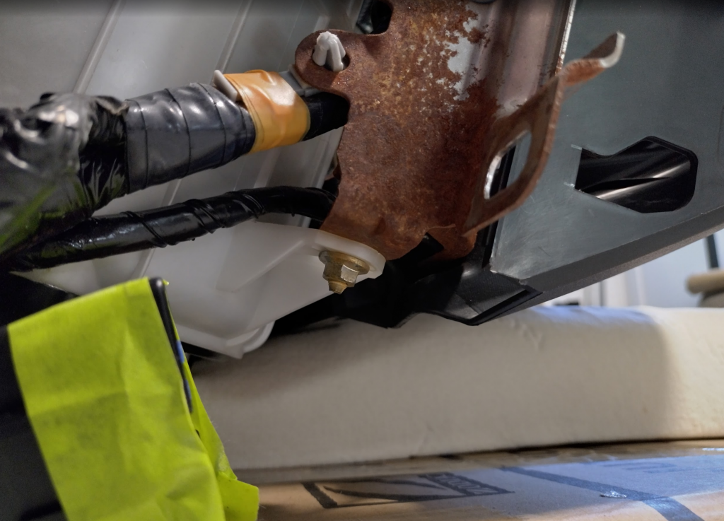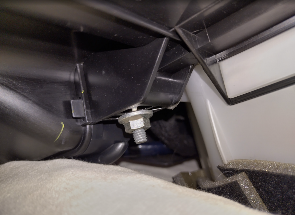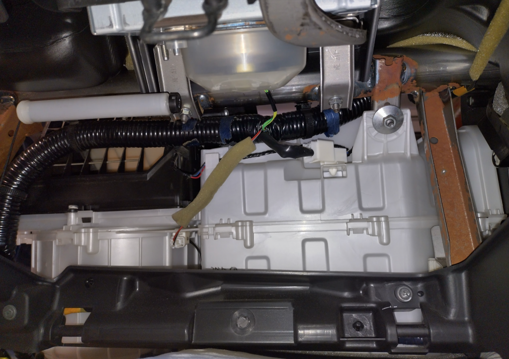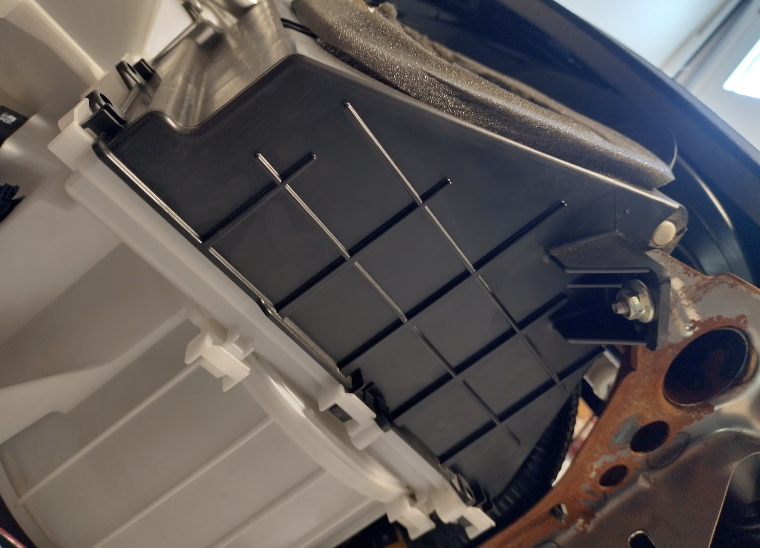 I suspect it’s down to the debris that sits in against it, in combination with it being constantly damp. This would cause it to corrode and create leaks. The debris are due to a quirk in the mx5 / miata where it doesn’t contain a cabin air filter from the outside. This is the hole where one should be – you can see the black windscreen cowl through the second hole.