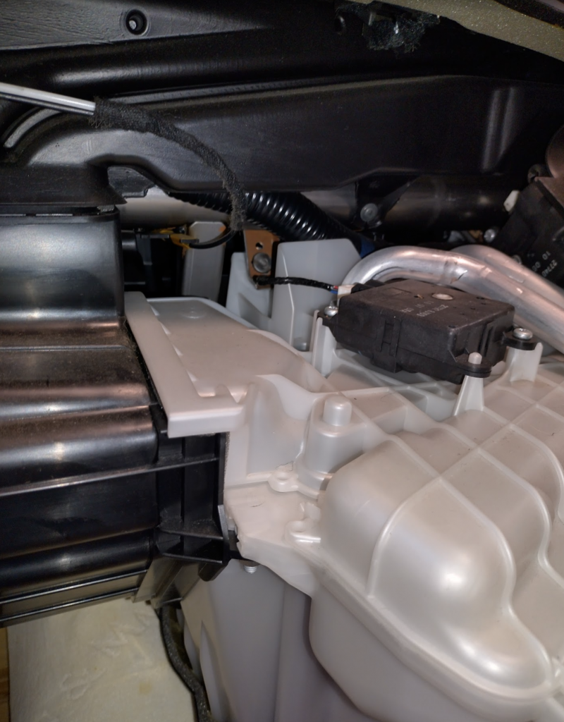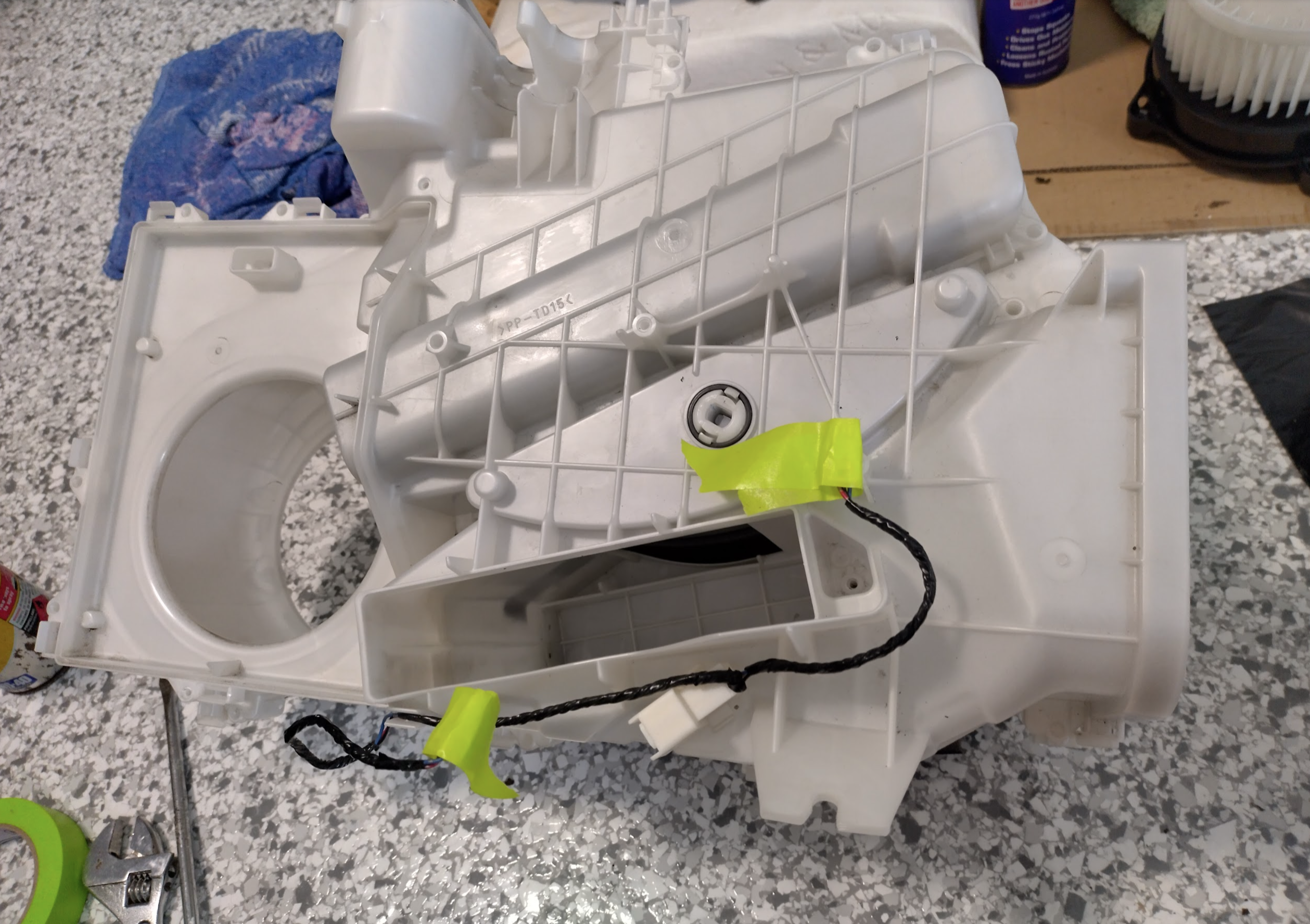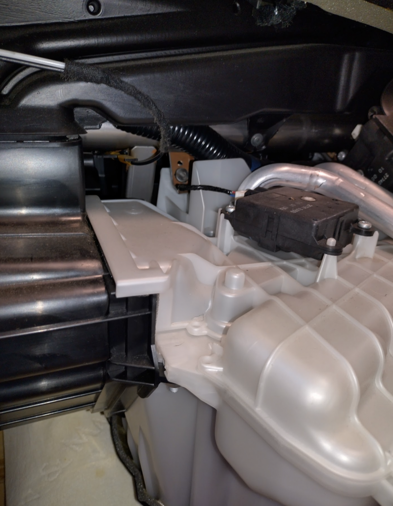 Then depending on whether we’re heating or cooling, a large curved movable barrier decides whether to direct air over the heater core before it goes in to the black section, or whether to just let the heatercore sit to the side in its own warm pocket.