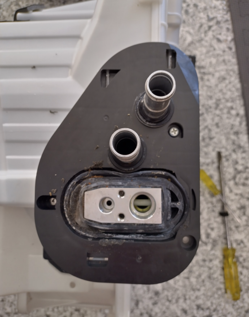 Then remove it by undoing one screw, unclipping a few clips, and remove the rubber seals (almost like rings or washers) around the heater pipes. There’s a stuck rubber seal around the evaporator pipes (this does actually come off), it takes a little bit of force to pull the black panel off due to that.