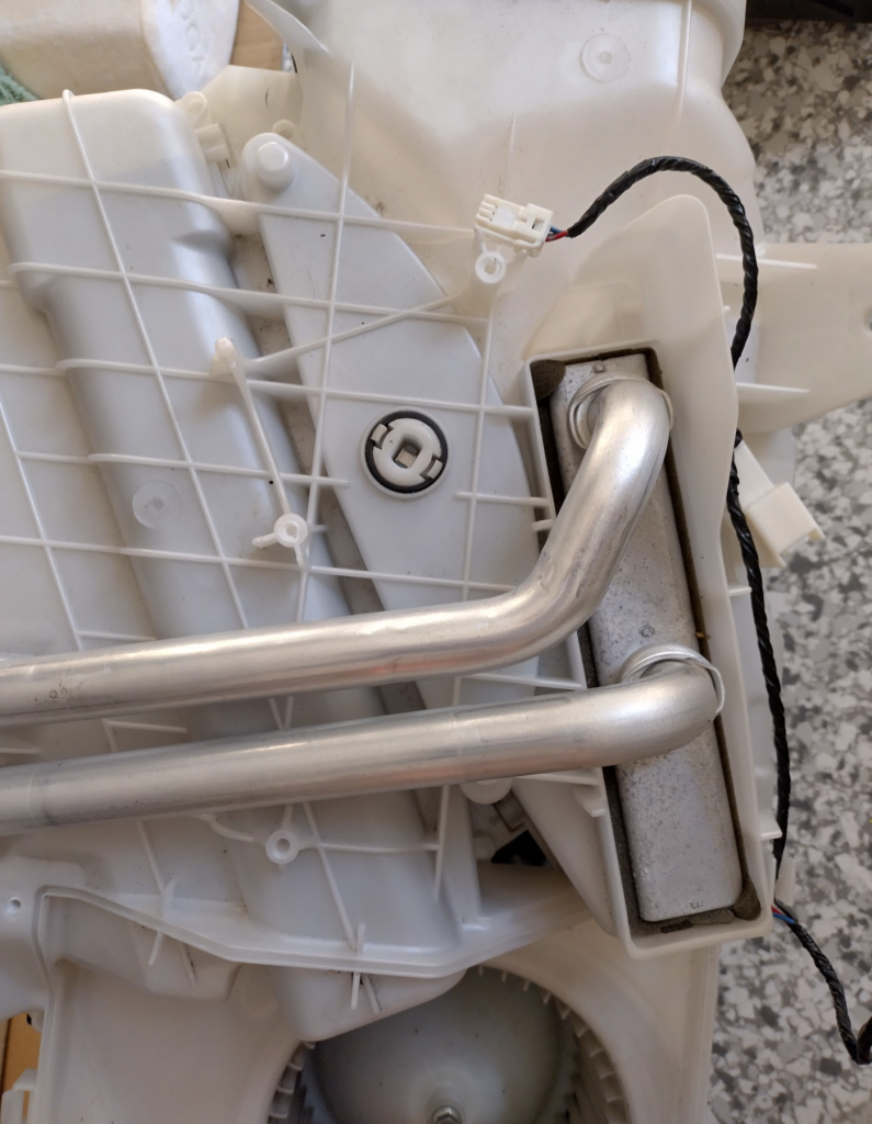 To remove the evaporator it just slides out, but has one plug which is actually a probe that needs pulling out – record where this is. You can also see a stain which from a video about replacing the evaporator they suggest it could be the dye they use to find leaks?