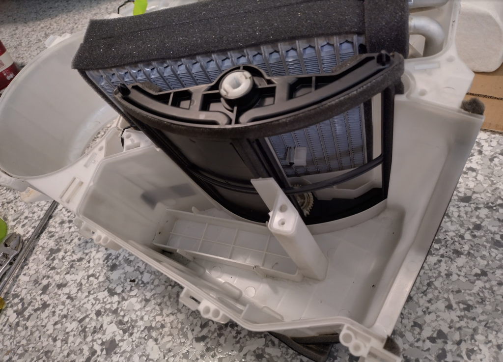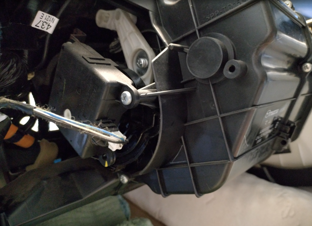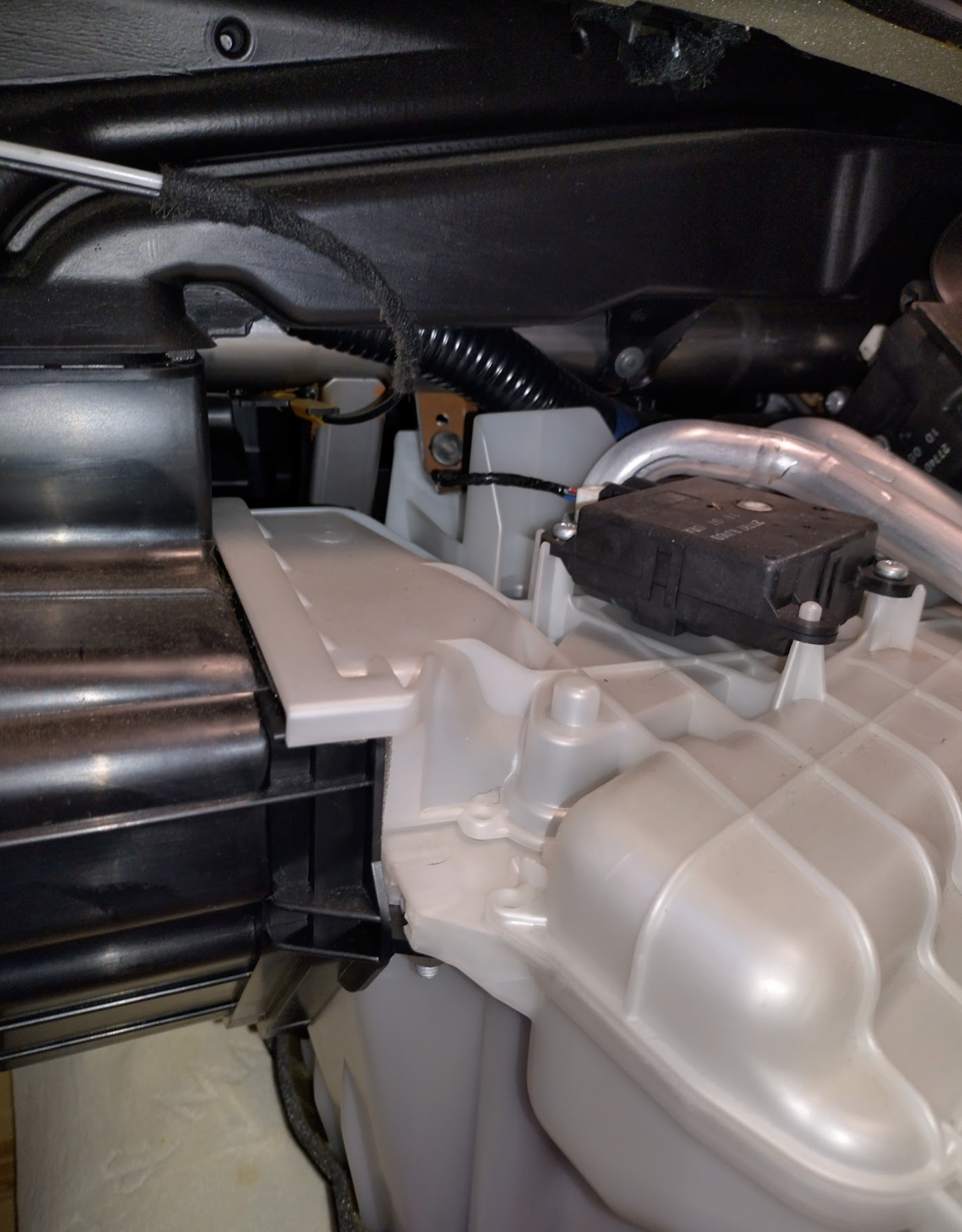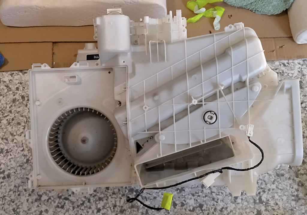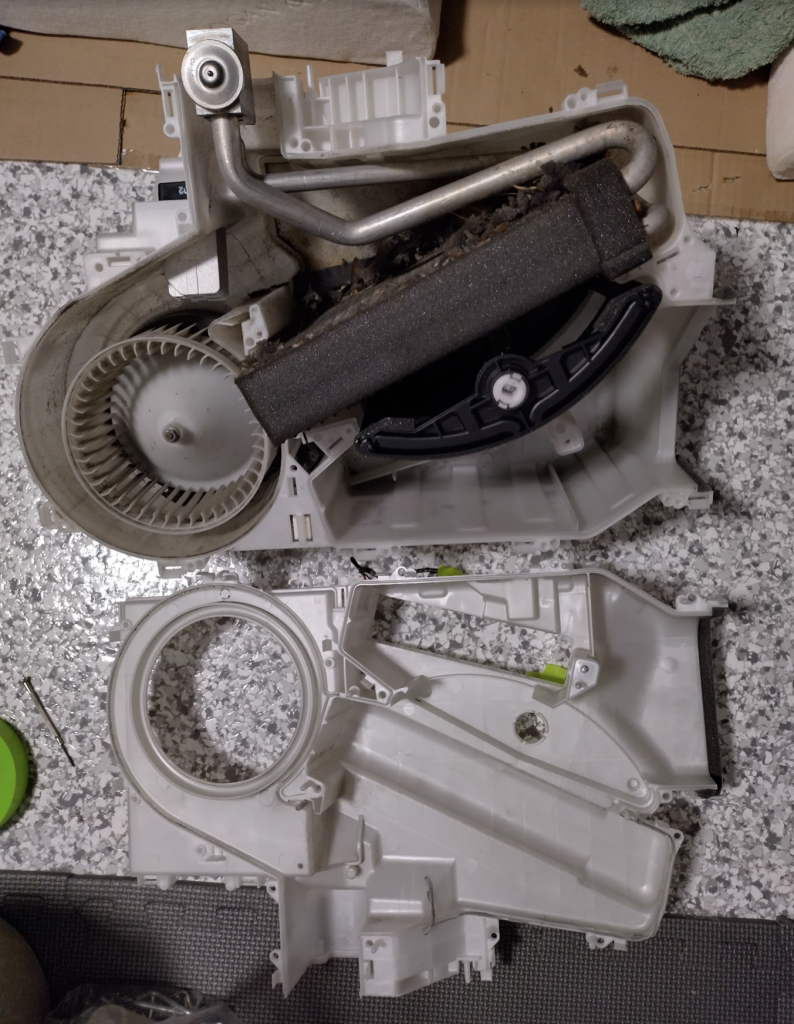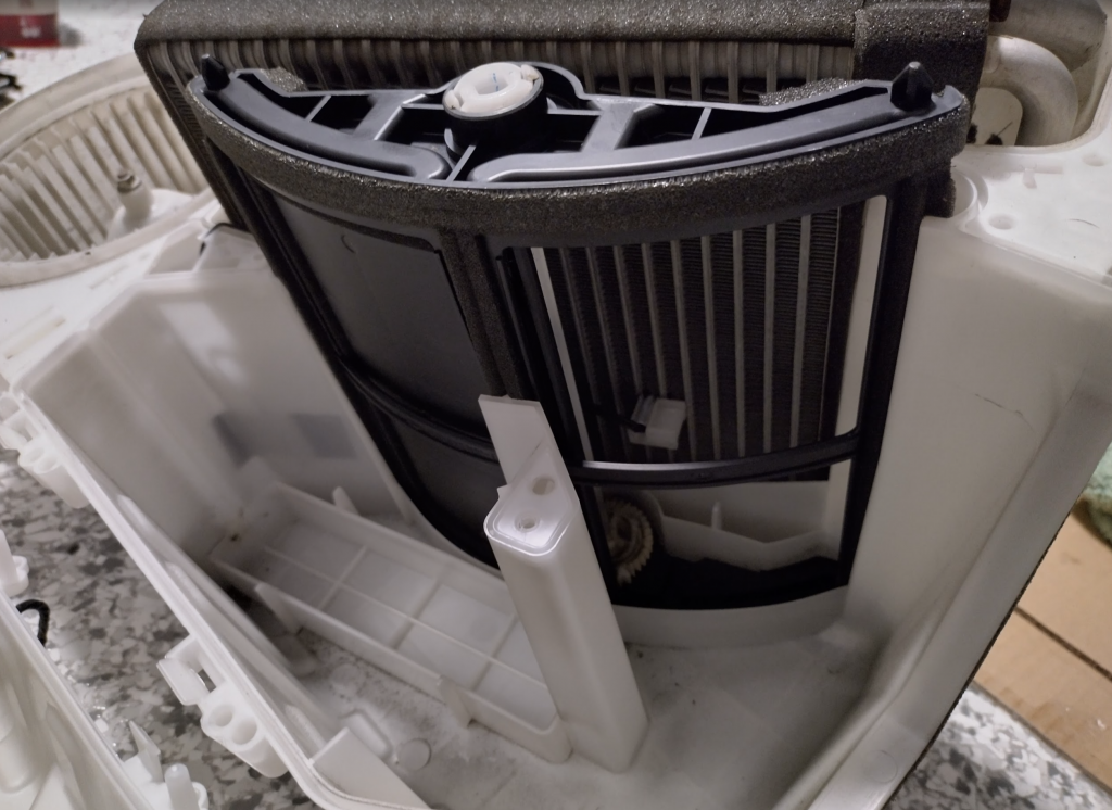 To get to the evaporator finally, we need to remove the top white cover area with 3 screws and a lot of clips all around and a few hidden within it (mainly near the blower). Once you have loosened one side the rest will come free a little easier.