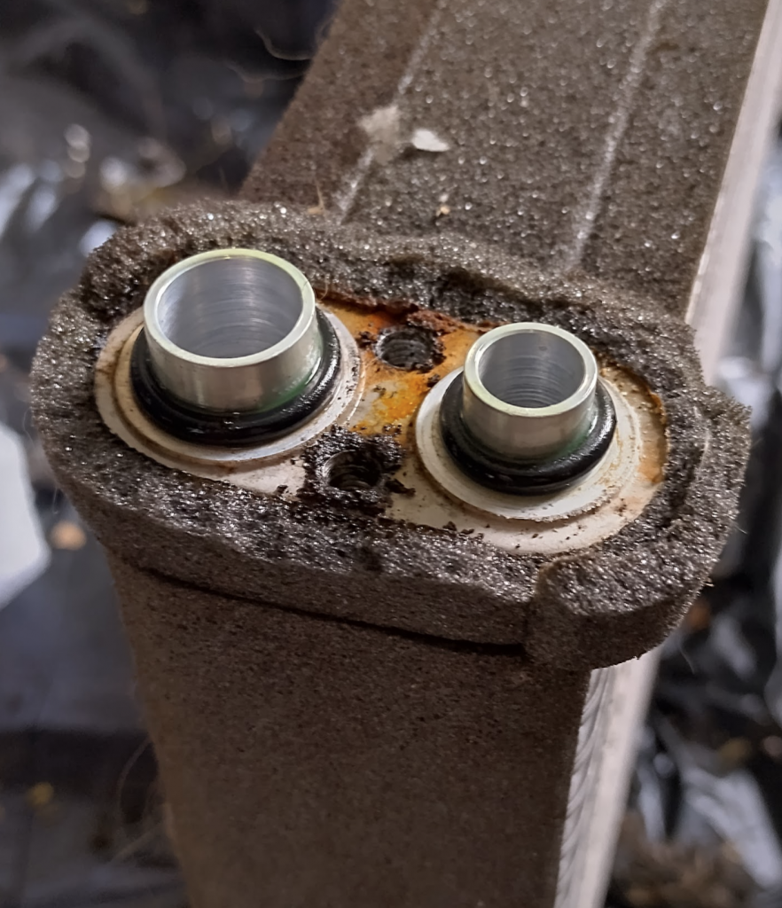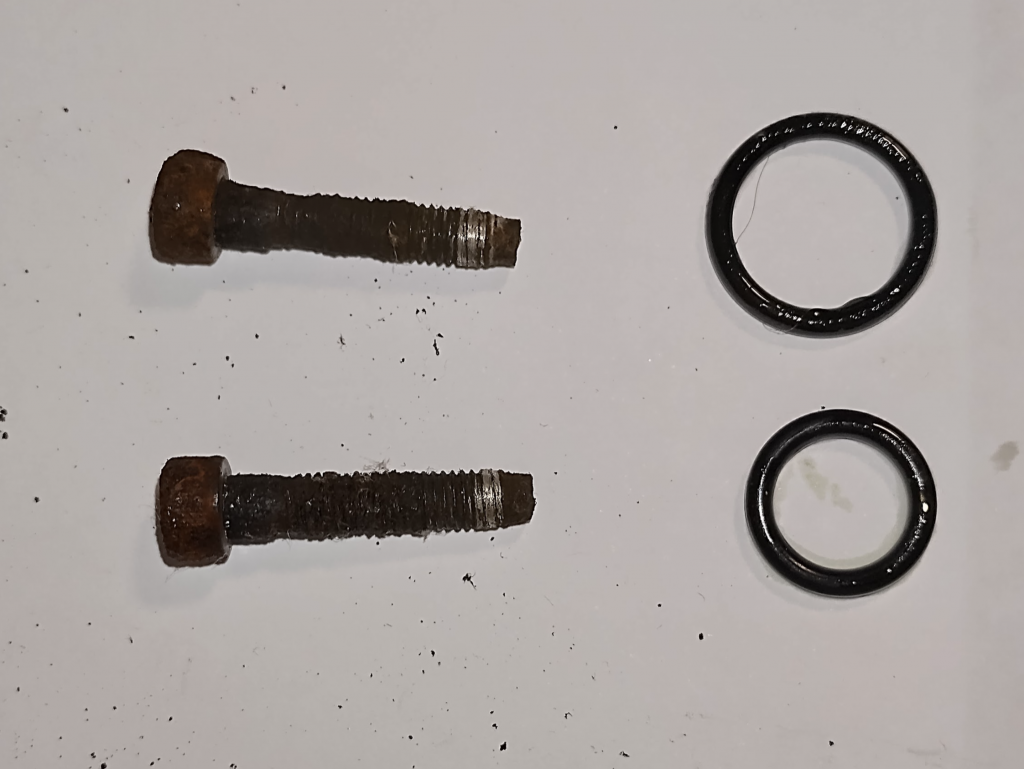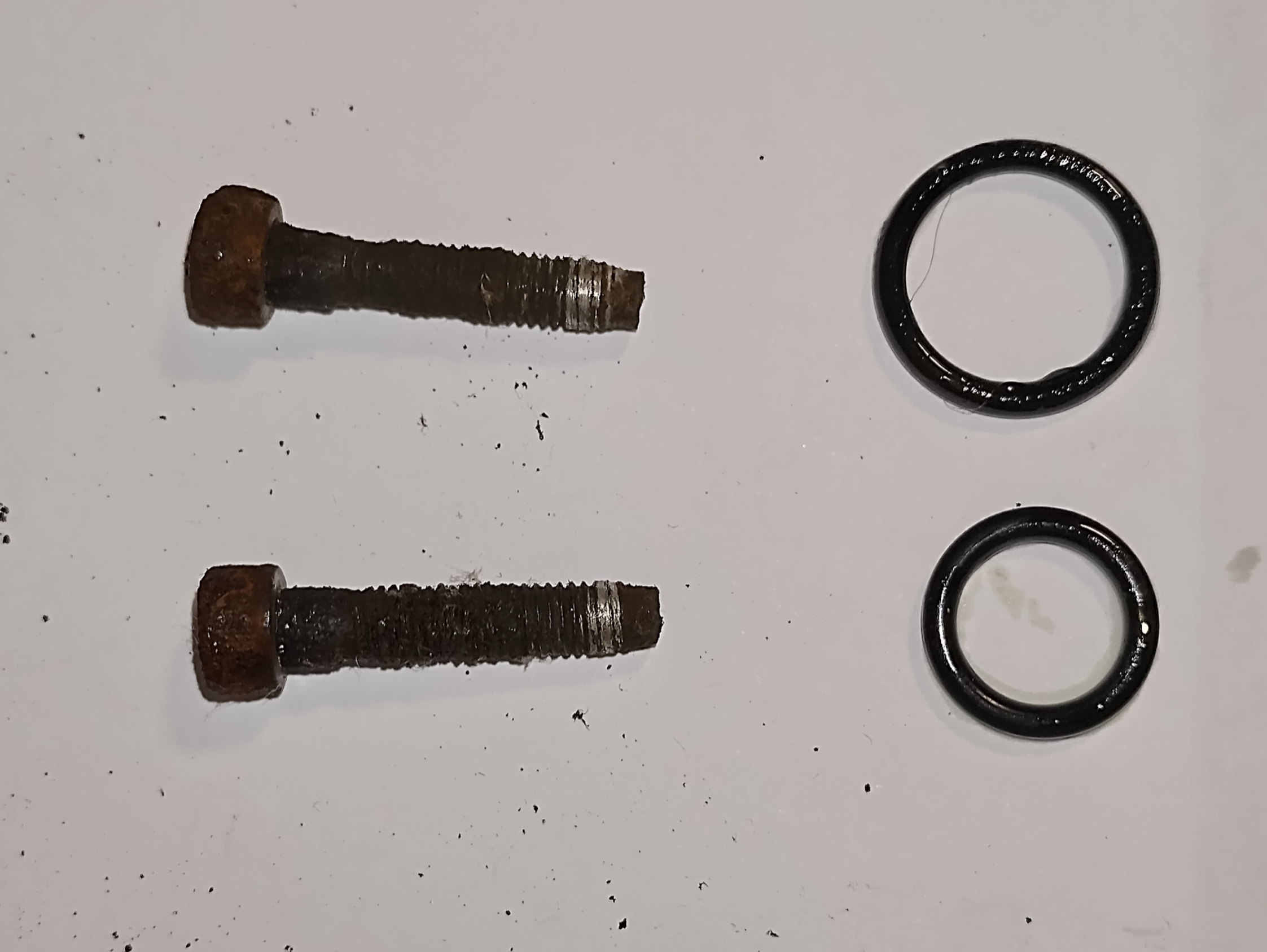 The o-rings are looking really good so we’ll re-use those, and even though the bolts look decent (as in they aren’t eaten through) and would last another 15 years I’ll try to use the new (slightly shorter) bolts that came with the new one to hold a plate on.