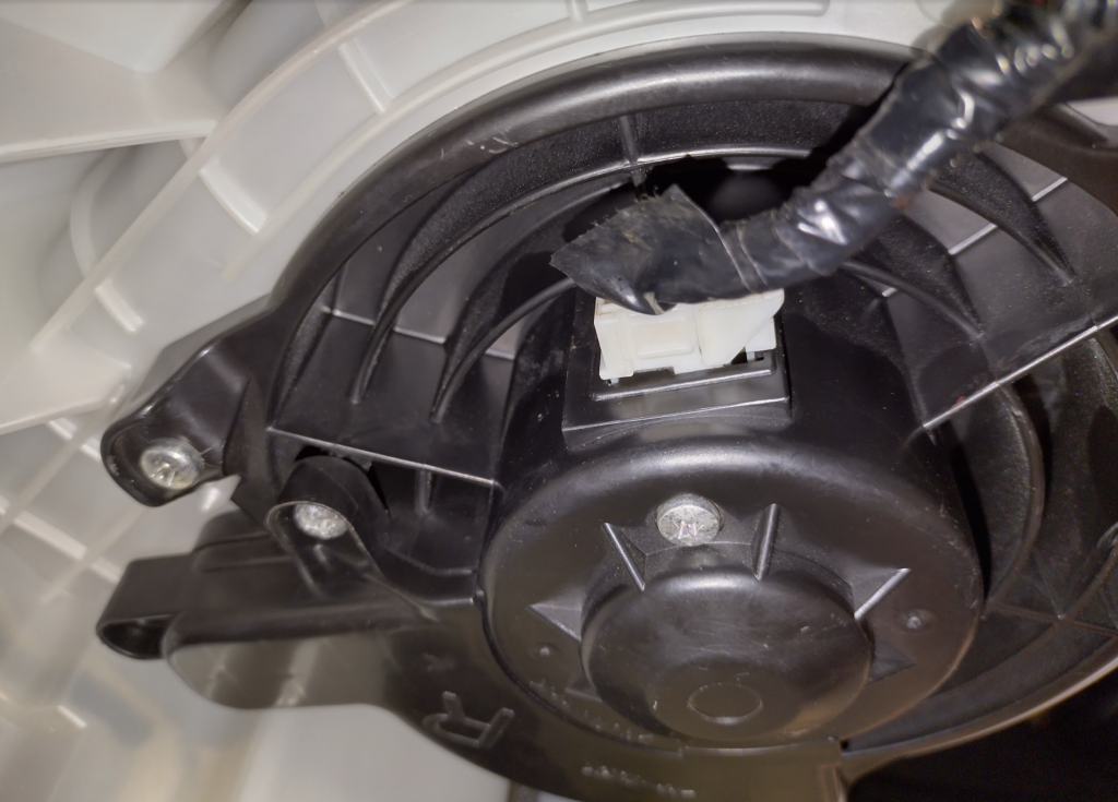 To give this a proper clean I need to remove the blower, which is just a few screws underneath. Take note of where the plug is (pointing to the top left in this photo) – the blower can only go in one position anyway due to the plastic spikes next to each screw.