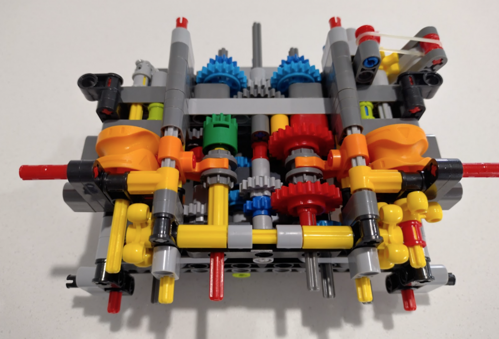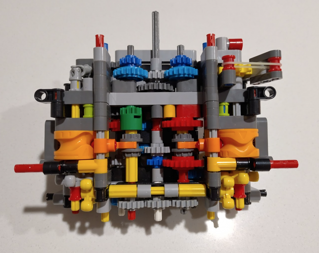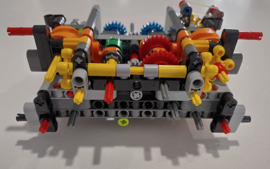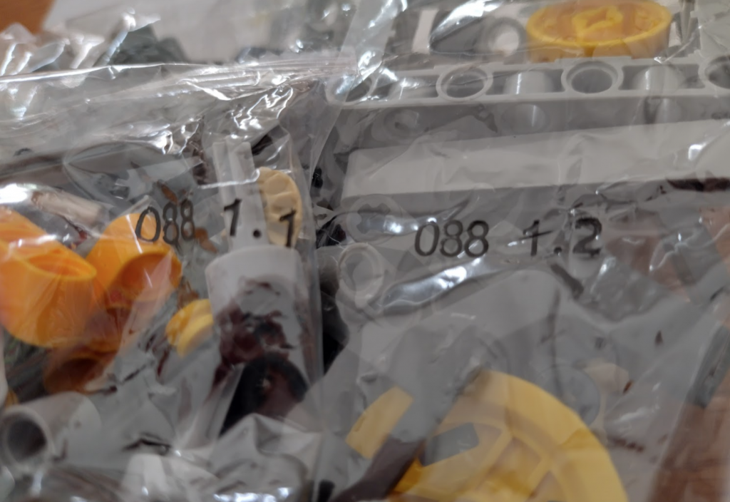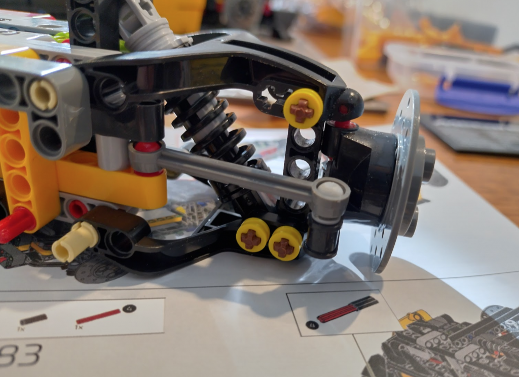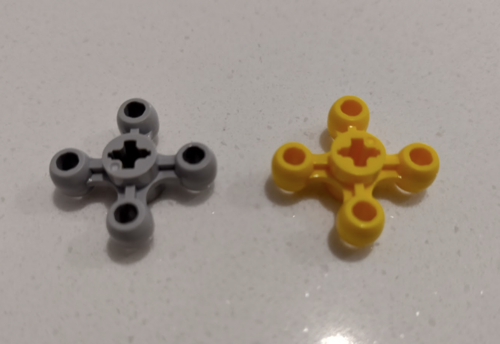 With this set I couldn’t get the orange arrows lined up 100% correctly but close, then wondered why they put a grey one in at all – why not just use 3 yellows. Then it clicked why I couldn’t get the large orange wheels to line up to where the instructions wanted them. Officially different colours are sometimes used to indicate slight changes. Some identical connectors are different colours to indicate whether they are looser or tighter. In this case the two knobby gear things are meant to have different axle orientations. The grey is meant to be 45 degrees different.