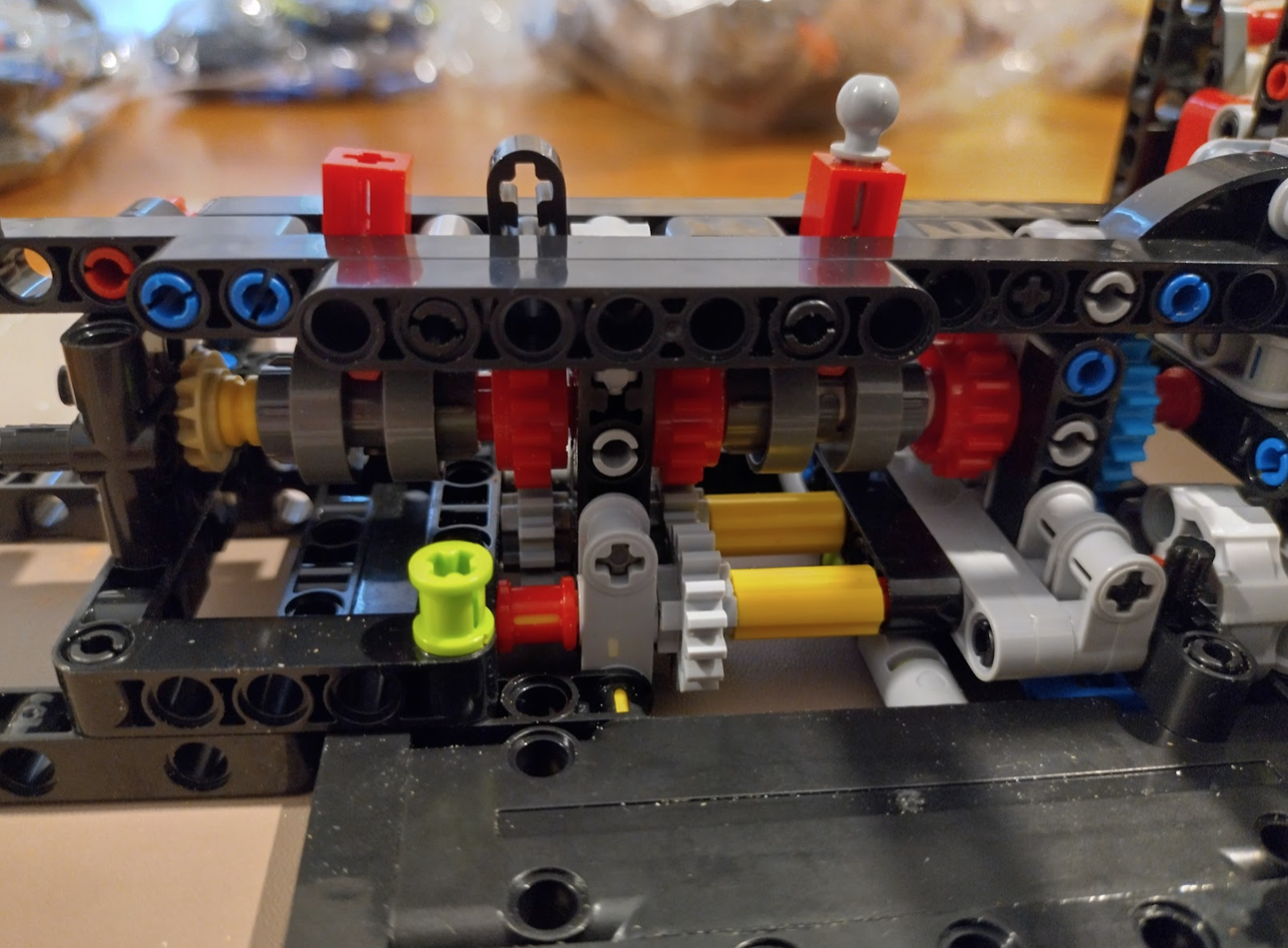 This is a good example of where the tolerances change it a little. Some of these gears are held in by the light coloured “snap-in” axel pieces. These don’t spin as easily as they probably should, which makes this whole area a little different to the official version.
